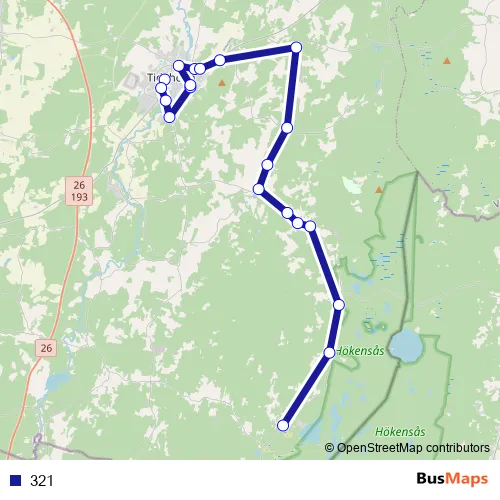 The first stop of the 321 bus route is Tidaholm busstation and the last stop is Klämman. 321 is operational during on weekdays.