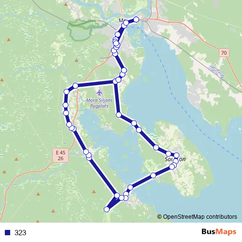 The first stop of the 323 bus route is Mora station and the last stop is Mora station. 323 is operational during everyday.