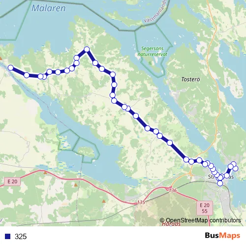 The first stop of the 325 bus route is Sundbyvägen and the last stop is Björsund östra. 325 is operational during on weekdays.