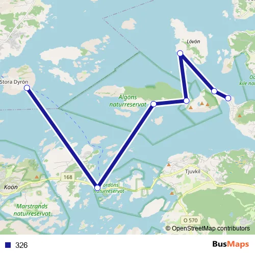 The first stop of the 326 ferry route is Rörtången bryggan and the last stop is Dyrön södra. 326 is operational during everyday.