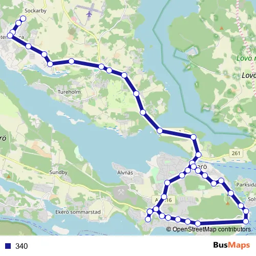 The first stop of the 340 bus route is Stenhamra Solbacka and the last stop is Ekerö centrum. 340 is operational during everyday.