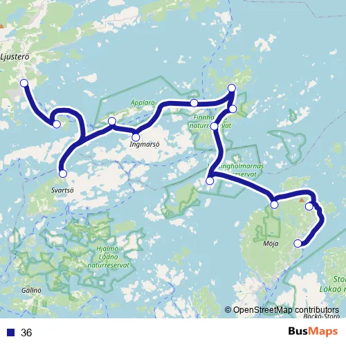 The first stop of the 36 ferry route is Åsättra brygga and the last stop is Ramsmora. 36 is operational during everyday.