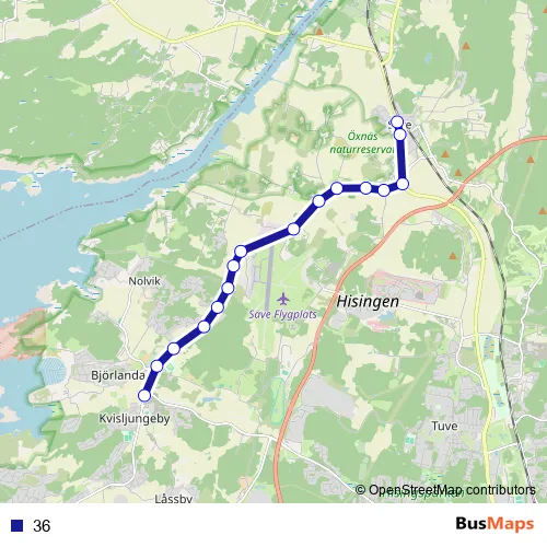 The first stop of the 36 bus route is Säve station and the last stop is Skra Bro. 36 is operational during everyday.
