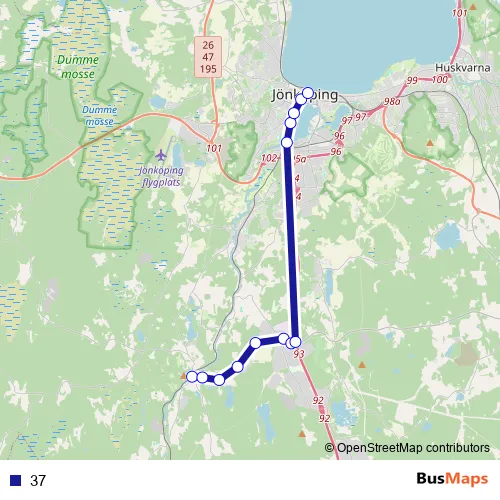The first stop of the 37 bus route is Taberg centrum and the last stop is Jönköping Rådhusparken. 37 is operational during on weekdays.