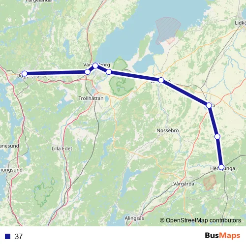 The first stop of the 37 bus route is Öxnered station and the last stop is Uddevalla Centralstation. 37 is operational during everyday.