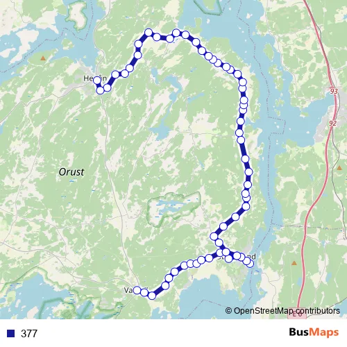 The first stop of the 377 bus route is Varekil busstation and the last stop is Henån busstation. 377 is operational during everyday.