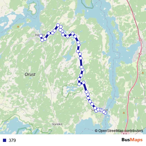 The first stop of the 379 bus route is Svanesund färjeläge and the last stop is Henån busstation. 379 is operational during on weekdays.