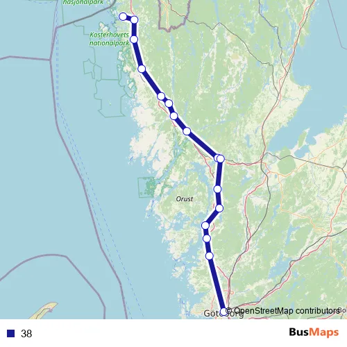 The first stop of the 38 bus route is Strömstad station and the last stop is Stenungsund station. 38 is operational during everyday.