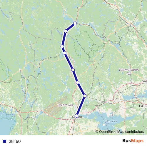 The first stop of the 38190 rail route is Örebro Centralstation and the last stop is Ludvika station. 38190 is operational during on weekdays.