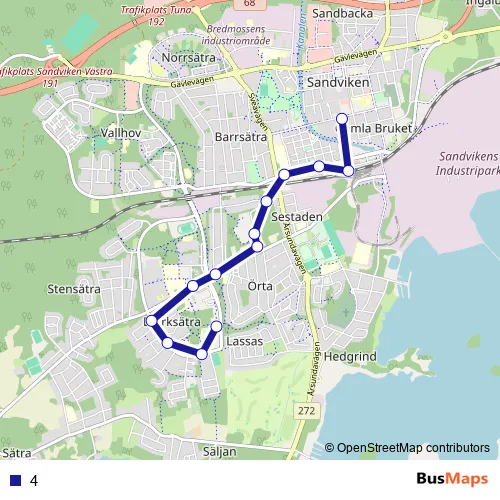 The first stop of the 4 bus route is Sandviken Kremlan and the last stop is Sandviken centrum. 4 is operational during everyday.