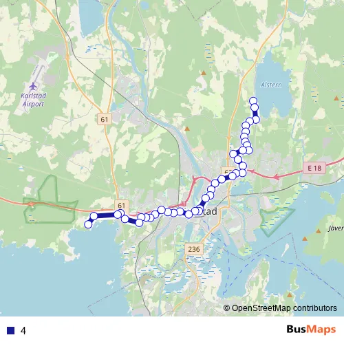 The first stop of the 4 bus route is Edsgatan, Karlstad and the last stop is Skutberget camping, Karlstad. 4 is operational during everyday.