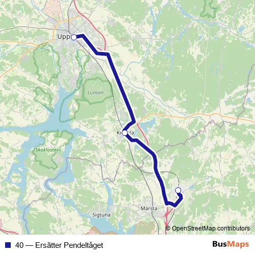 The first stop of the 40 bus route is Uppsala Centralstation and the last stop is Sky City. 40 (Ersätter Pendeltåget) is operational during on weekends.