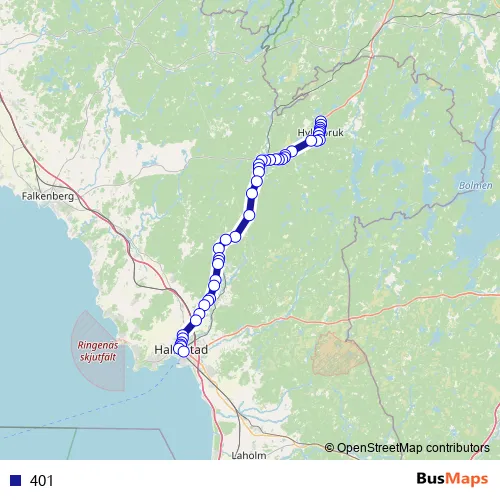 The first stop of the 401 bus route is Hyltebruk Hallonvägen and the last stop is Halmstad C Resecentrum. 401 is operational during everyday.
