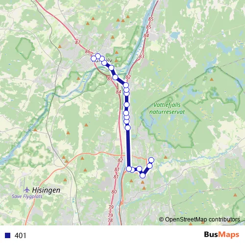 The first stop of the 401 bus route is Angered centrum and the last stop is Kungälv resecentrum. 401 is operational during everyday.