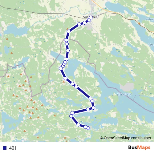 The first stop of the 401 bus route is Hävla affären and the last stop is Vingåker station. 401 is operational during on weekdays.