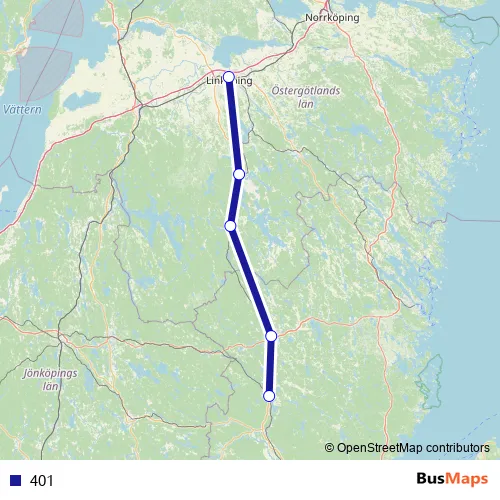 The first stop of the 401 bus route is Hultsfred station and the last stop is Linköping Centralstation. 401 is operational during everyday.