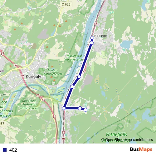 The first stop of the 402 bus route is Bohus Jennylund and the last stop is Nödinge station. 402 is operational during everyday.