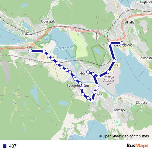 The first stop of the 407 bus route is Kavelvägen and the last stop is Örnsköldsvik Örnparken. 407 is operational during everyday.