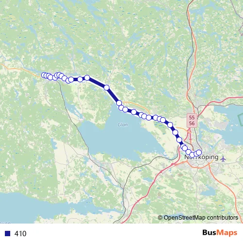 The first stop of the 410 bus route is Finspång Mellangrind and the last stop is Norrköping Centralstation. 410 is operational during everyday.