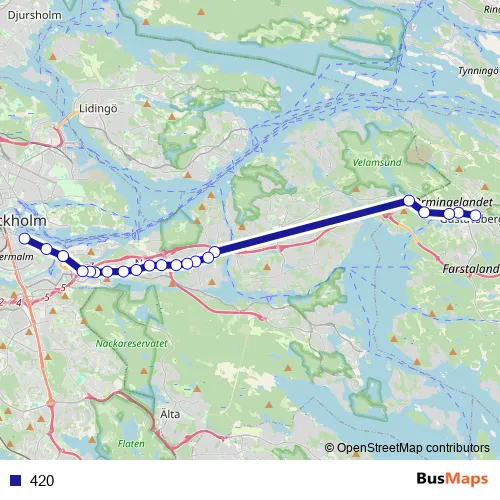 The first stop of the 420 bus route is Gustavsberg centrum and the last stop is Slussen bussterminal. 420 is operational during on weekdays.