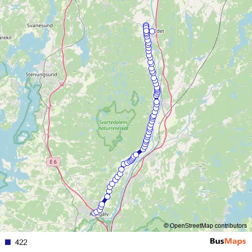 The first stop of the 422 bus route is Kungälv resecentrum and the last stop is Lilla Edet busstation. 422 is operational during everyday.