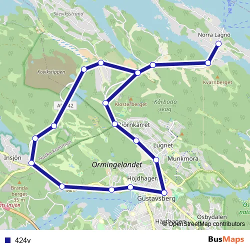 The first stop of the 424v bus route is Gustavsberg centrum and the last stop is Gustavsberg centrum. 424v is operational during everyday.