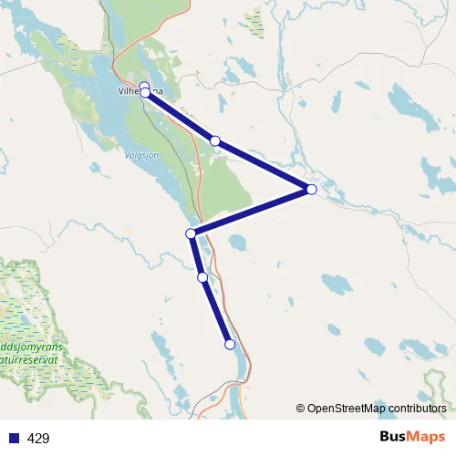The first stop of the 429 bus route is Vilhelmina Hembergsskolan and the last stop is N Meselefors. 429 is operational during on weekdays.