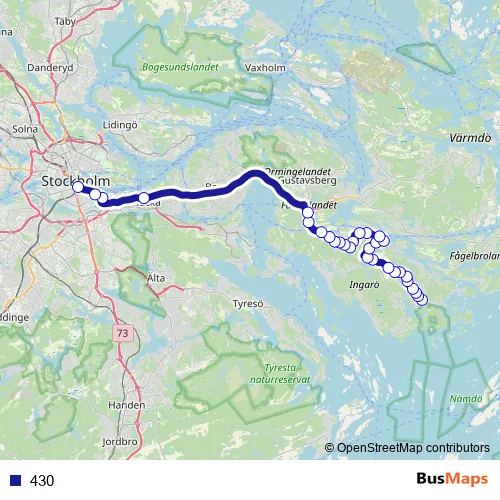 The first stop of the 430 bus route is Eknäs brygga and the last stop is Slussen. 430 is operational during everyday.