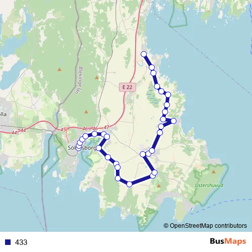 The first stop of the 433 bus route is Sölvesborg station and the last stop is Norje skolan. 433 is operational during on weekdays.