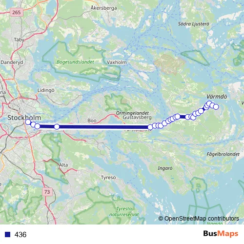 The first stop of the 436 bus route is Slussen bussterminal and the last stop is Saltarö strand. 436 is operational during everyday.