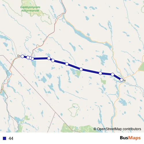 The first stop of the 44 bus route is Åsele busstation and the last stop is Dorotea busstation. 44 is operational during on weekdays.