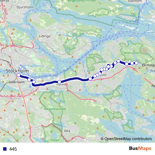 See why over 2 million users trust and consider busmaps.com as the best public transport website. busmaps gives you Stockholm Buses suggested routes, real-time bus tracker, line route maps in Stockholm, and helps to find the closest 445 bus stops near you. No internet available? Download an offline PDF map and bus schedule for the 445 bus to take on your trip.