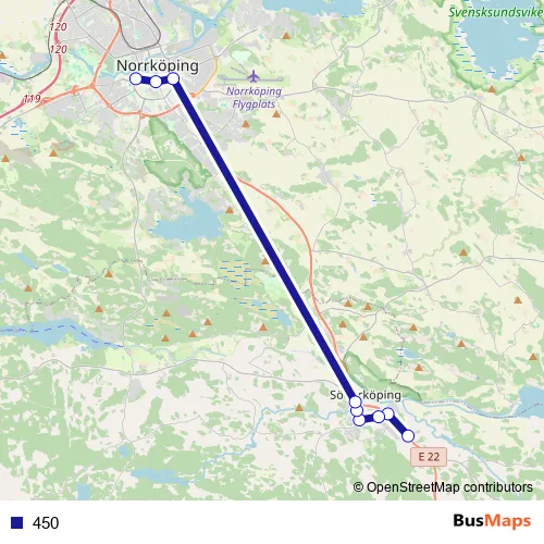 The first stop of the 450 bus route is Söderköping Sparvstigen and the last stop is Norrköping Väster Tull. 450 is operational during everyday.
