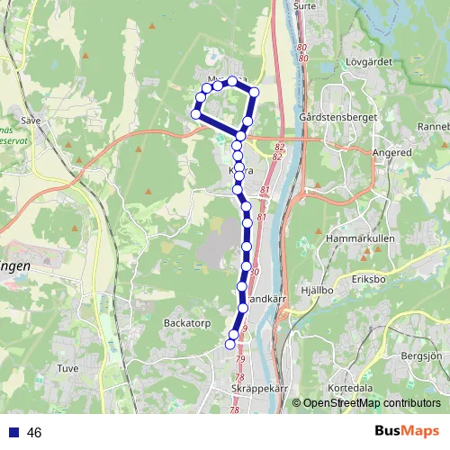 The first stop of the 46 bus route is Kärra Klareberg and the last stop is Körkarlens gata. 46 is operational during on weekdays.