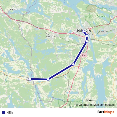 The first stop of the 48h bus route is Södertälje centrum station and the last stop is Gnesta station. 48h is operational during everyday.