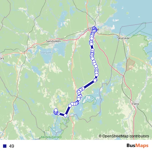 The first stop of the 49 bus route is Mumman and the last stop is Österfärnebo Klappsta. 49 is operational during everyday.