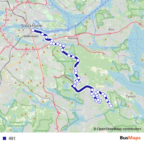 The first stop of the 491 bus route is Slussen and the last stop is Nyfors. 491 is operational during everyday.