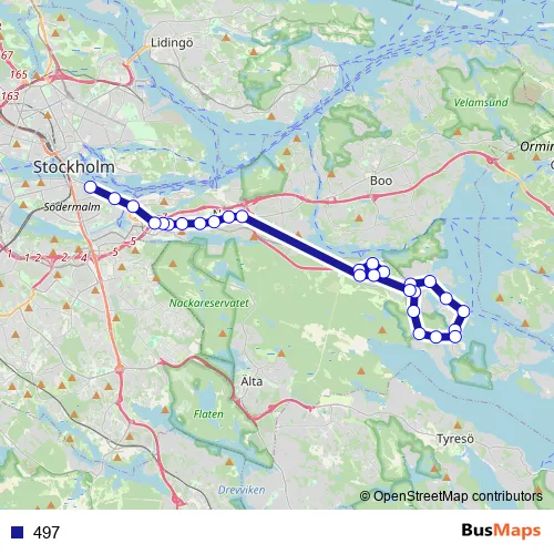 The first stop of the 497 bus route is Igelboda station and the last stop is Stockholm Central Vasagatan. 497 is operational during everyday.