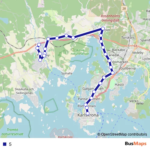 See why over 2 million users trust and consider busmaps.com as the best public transport website. busmaps gives you Karlskrona Buses suggested routes, real-time bus tracker, line route maps in Karlskrona, and helps to find the closest 5 bus stops near you. No internet available? Download an offline PDF map and bus schedule for the 5 bus to take on your trip.