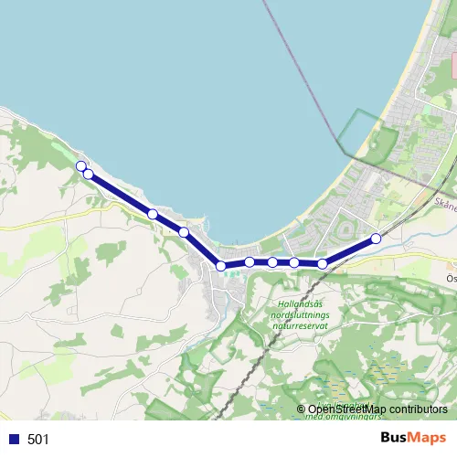 The first stop of the 501 bus route is Båstad Norrviken and the last stop is Båstad station. 501 is operational during everyday.
