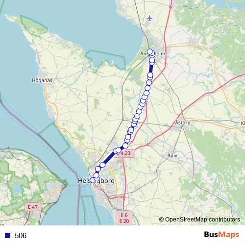 The first stop of the 506 bus route is Helsingborg Centralstation and the last stop is Ängelholm station. 506 is operational during everyday.