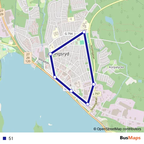 The first stop of the 51 bus route is Tingsryd busstation and the last stop is Tingsryd busstation. 51 is operational during on weekdays.