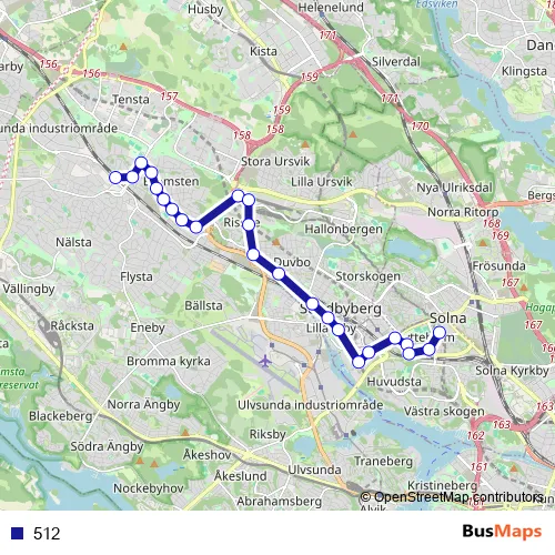 The first stop of the 512 bus route is Spånga station and the last stop is Solna centrum T-bana. 512 is operational during everyday.