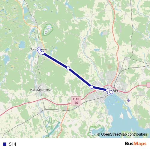 The first stop of the 514 bus route is Surahammar station and the last stop is Västerås Centralstation. 514 is operational during everyday.
