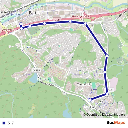 The first stop of the 517 bus route is Furulund centrum (Partille) and the last stop is Partille centrum. 517 is operational during everyday.