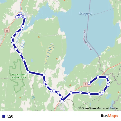 The first stop of the 520 bus route is Gullspång busstation and the last stop is Bahult. 520 is operational during on weekdays.