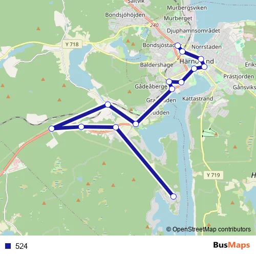 The first stop of the 524 bus route is Härnösand Bondsjöleden and the last stop is Södra Fällöviken. 524 is operational during on weekdays.