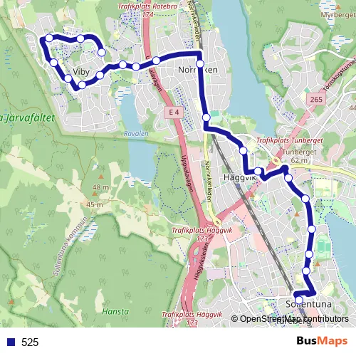 The first stop of the 525 bus route is Sollentuna station and the last stop is Pukvägen. 525 is operational during everyday.