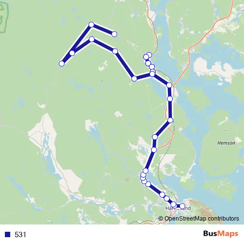 The first stop of the 531 bus route is Härnösand Landgrenshallen and the last stop is Ramsjö. 531 is operational during on weekdays.
