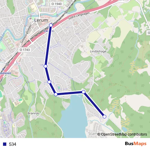 The first stop of the 534 bus route is Lerum station and the last stop is Lerum station. 534 is operational during everyday.